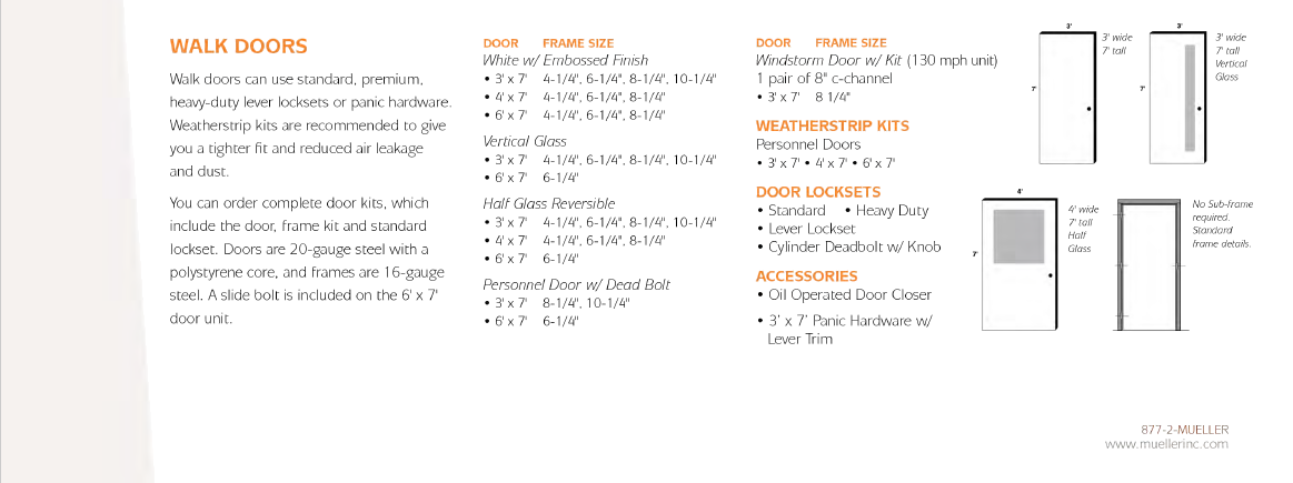 Walk doors can use standard, premium, heavy-duty lever locksets or panic hardware. Weatherstrip kits are recommended to give you a tighter fit and reduced air leakage and dust. You can order complete door kits, which include the door, frame kit and standard lockset. Doors are 20-gauge steel with a polystyrene core, and frames are 16-gauge steel. A slide bolt is included on the 6' x 7' door unit.